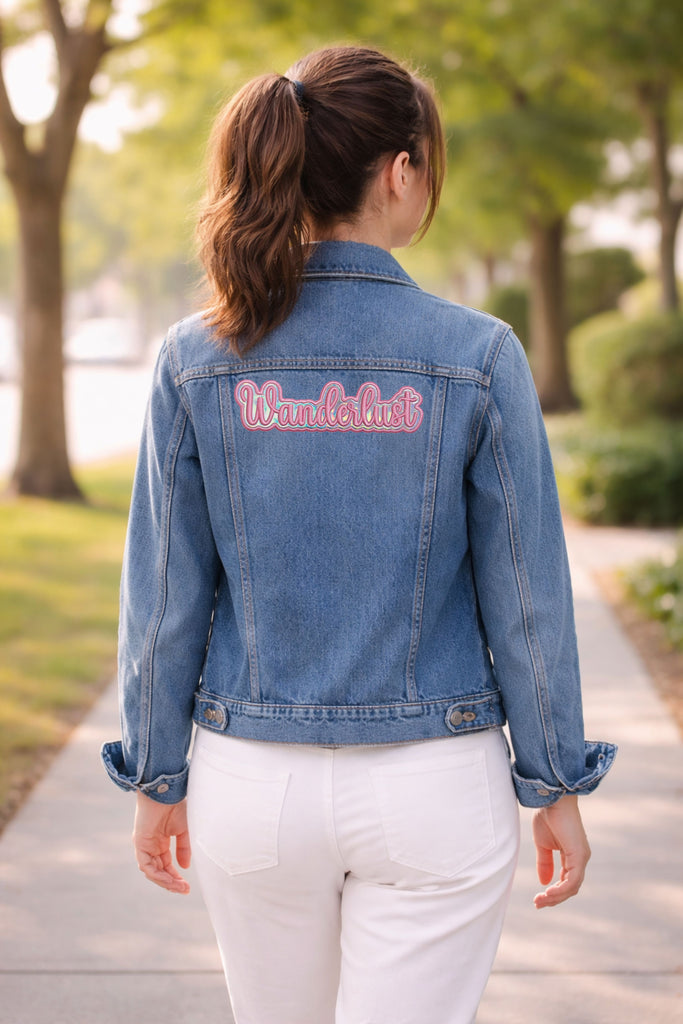 Add a bold, travel inspired statement to bags and accessories with this Wanderlust embroidered patch. Designed with shimmering iridescent fabric and raised 3D puff lettering, this patch is made to stand out on totes, pouches, backpacks, and everyday carry items.