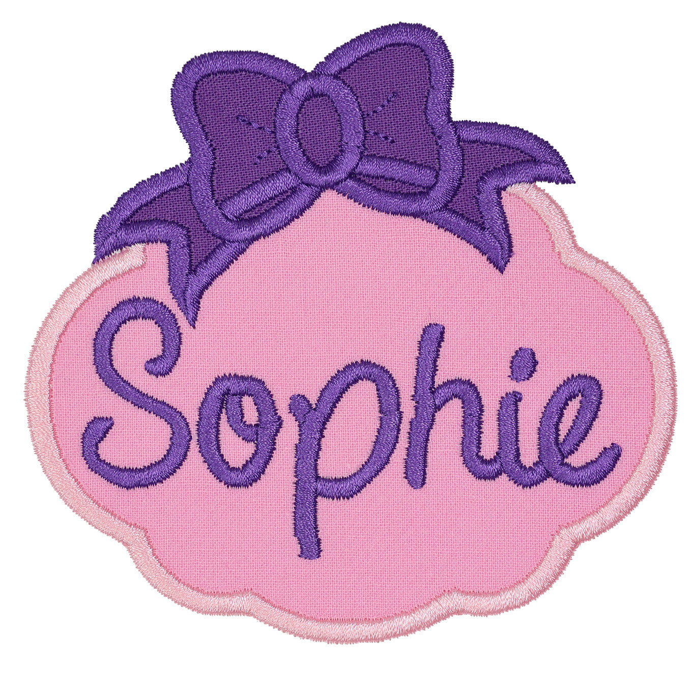 This sweet personalized name patch features a scalloped frame and bow detail, perfect for girls' backpacks, jackets, or clothing. A charming way to add a custom touch to school gear, birthday outfits, or everyday accessories.