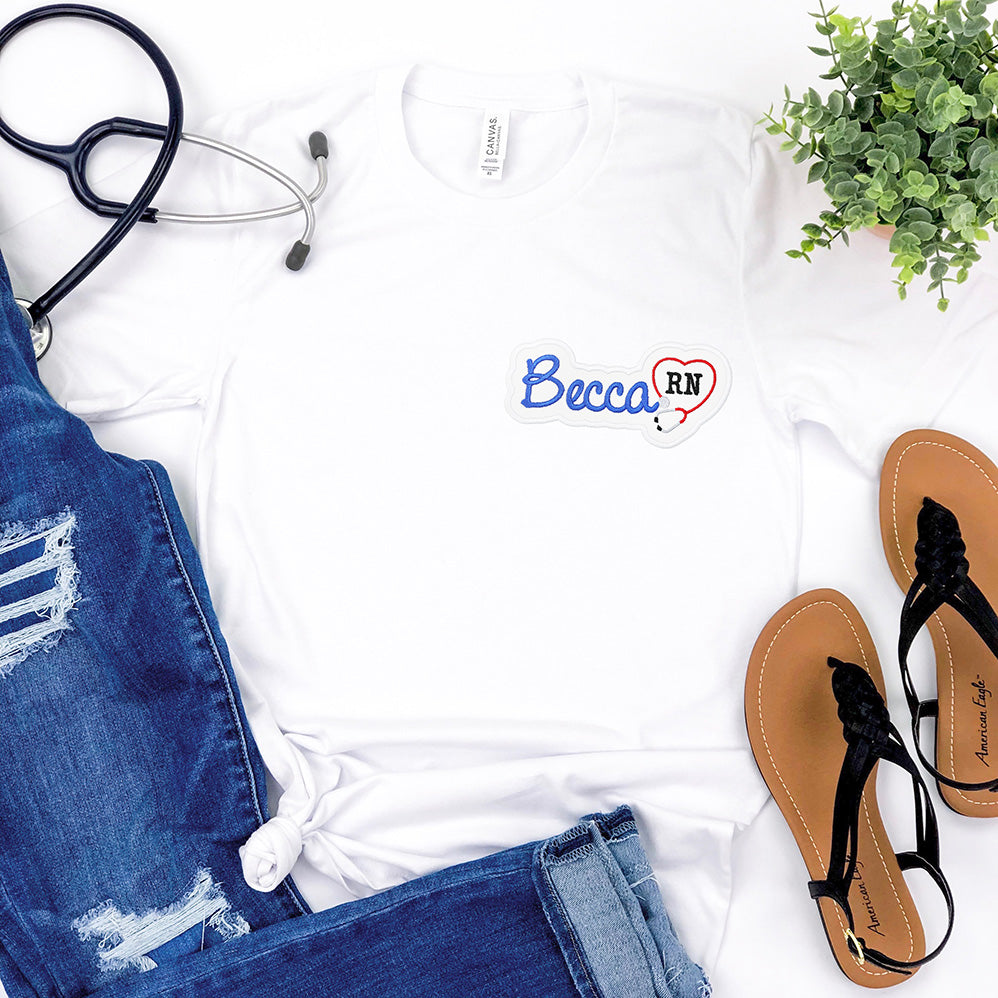 This custom nurse patch features your name stitched in script beside a heart-shaped stethoscope and bold “RN” initials. A perfect personalized touch for nursing uniforms, scrubs, tote bags, or gear.