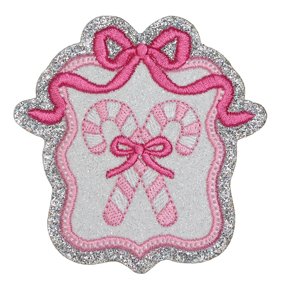 Add a sweet holiday sparkle to your projects with this Christmas candy cane patch. Designed with a glitter canvas base and detailed embroidery, this festive patch features two pink candy canes tied with a bow — perfect for adding charm to Christmas bags, stockings, or handmade gifts.