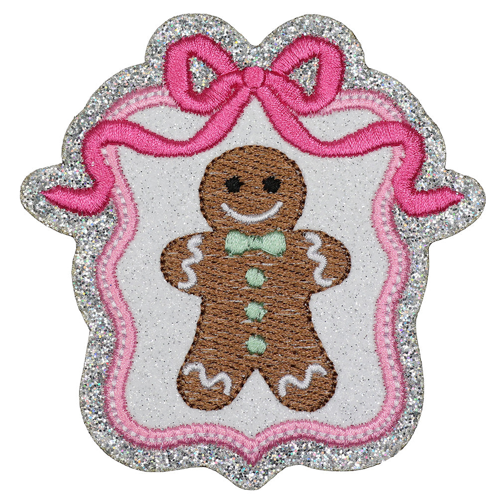 Add sweet holiday charm to your creations with this Christmas Gingerbread Sketch Patch. Featuring a silver glitter canvas base, pink embroidered bow, and a cheerful gingerbread man with a mint green bow tie, this patch brings festive sparkle to any project.
