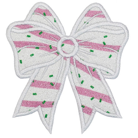 Add a sweet holiday sparkle to your projects with this Christmas Tree Cake Coquette Bow Patch. Designed with pink and white stripes, green sprinkles, and glitter fabric, this festive bow adds a cheerful handmade touch to your Christmas creations. Perfect for decorating shirts, bags, stockings or holiday decor.