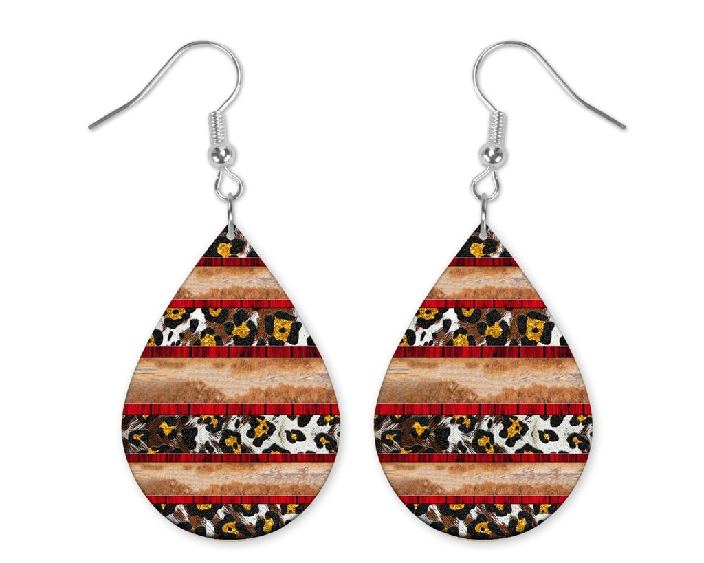 Cowhide Leopard and Red Stripes Handmade Wood Earrings